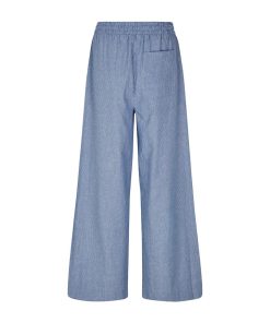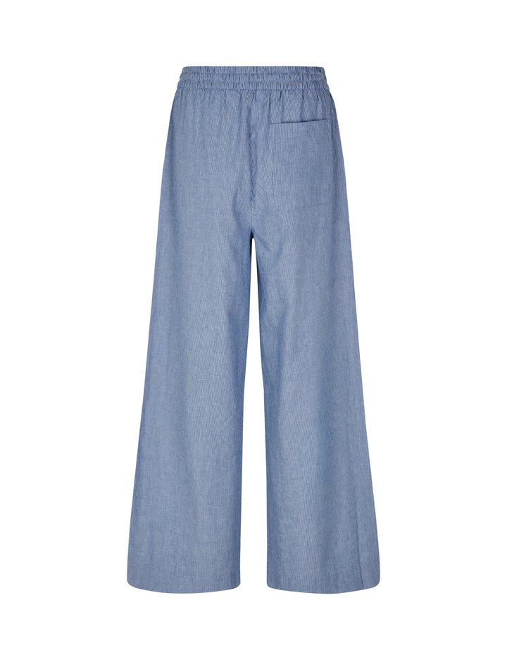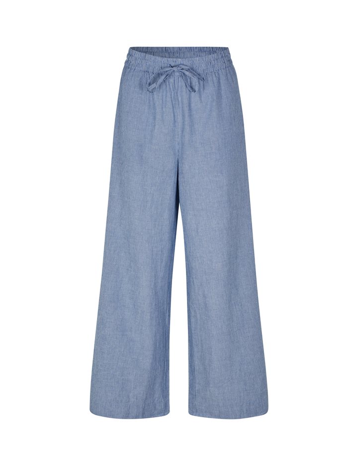Loose pants with elasticated tie waist.- Material: 100% Cotton- Straight legs- Elasticated tie waist- Back pocket- Relaxed fit- Thin white stripes on a blue background