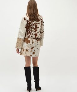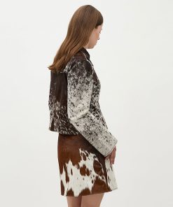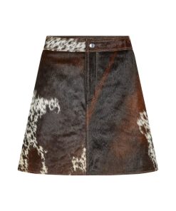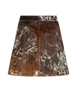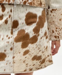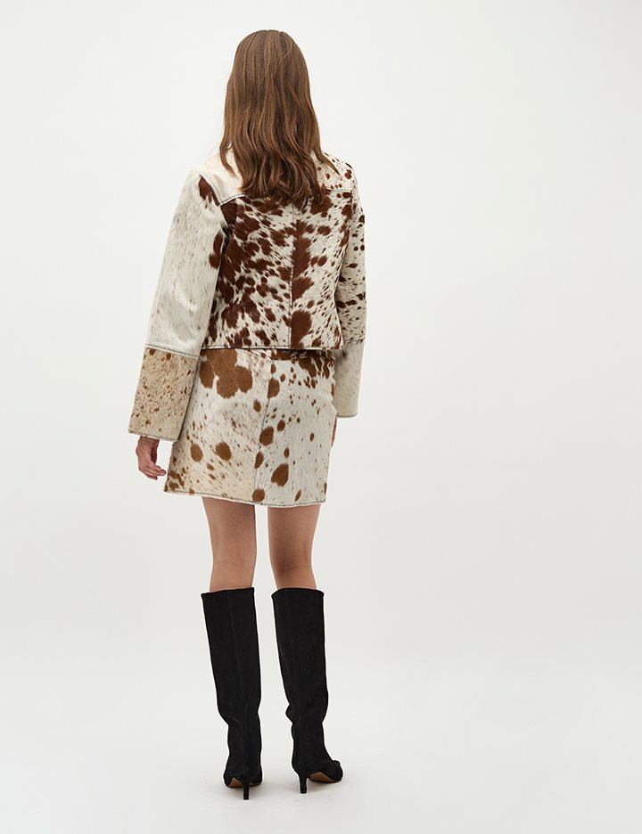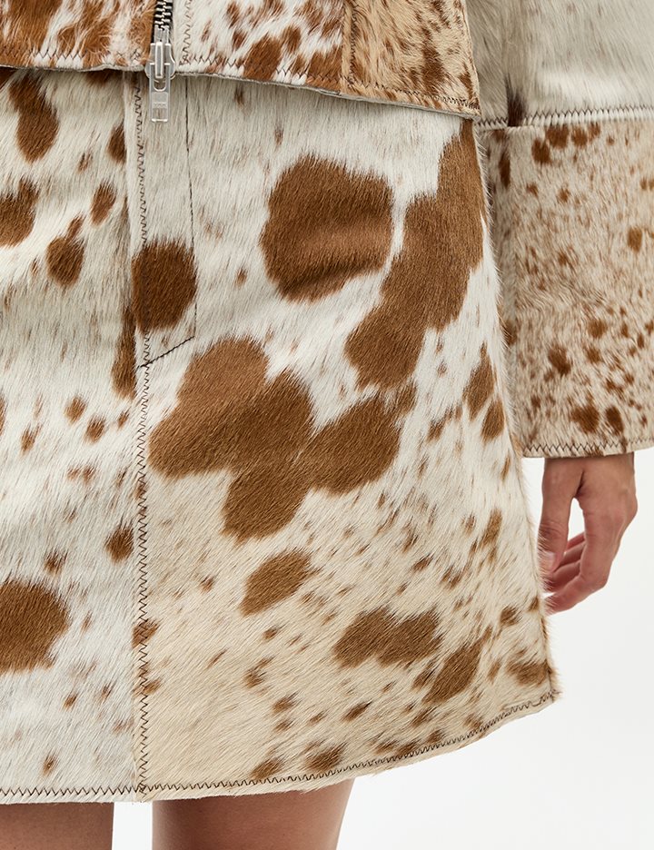 Unique cow and leather skirt. – Material: 100% Cow leather with hair- Normal fit- Closes with a zipper and button- Fully lined- Please note!! Each skirt comes with a unique pattern and color. The models height is 178 cm and is wearing a size S