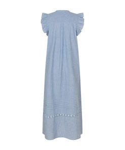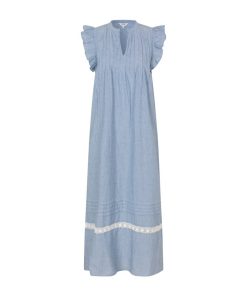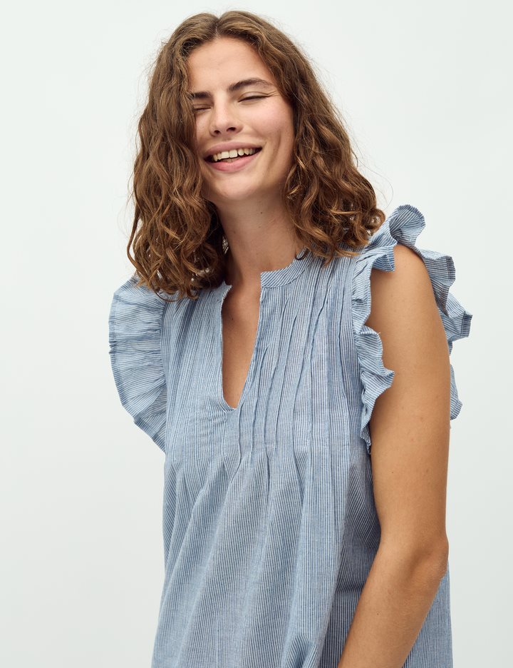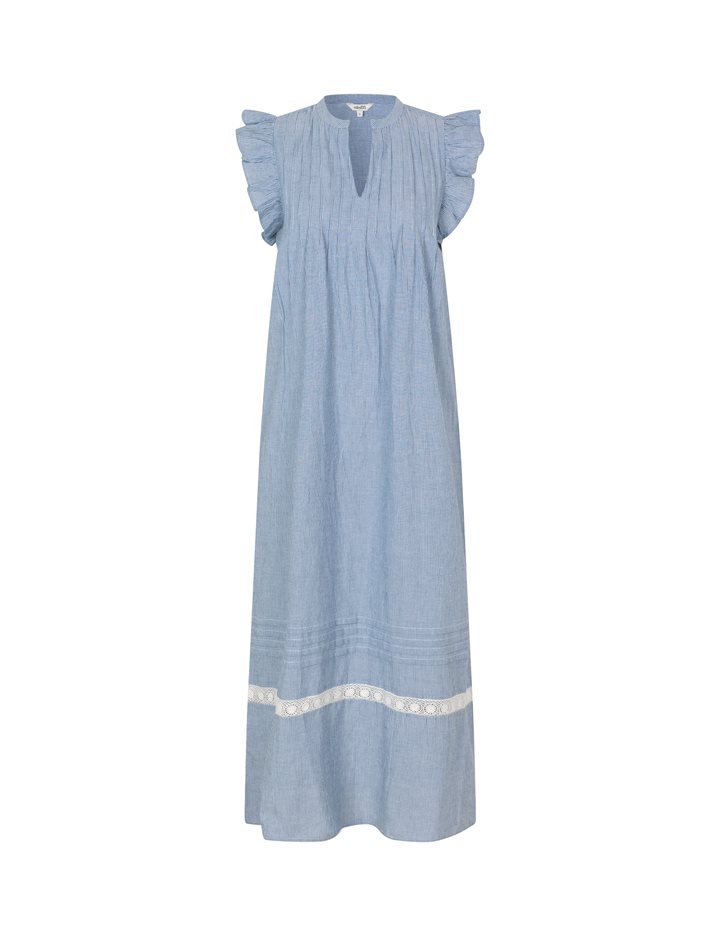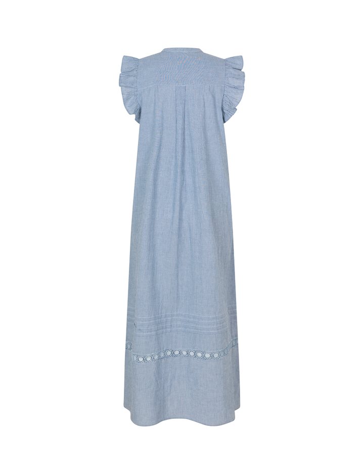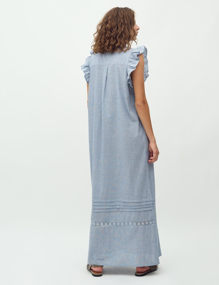 Maxi dress with ruffle details at the shoulder.- Material: 100% Cotton- Sleeveless- Round neck with v-neck- Relaxed fit- Maxi length- StripedThe model's height is 176 cm and she is wearing a size S.