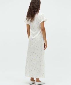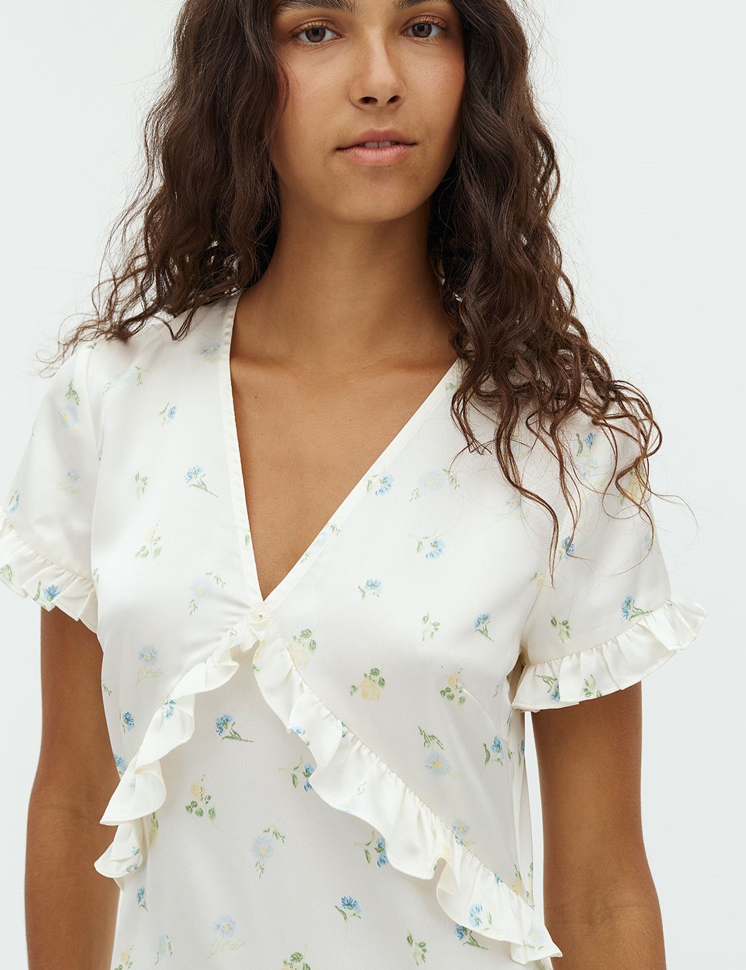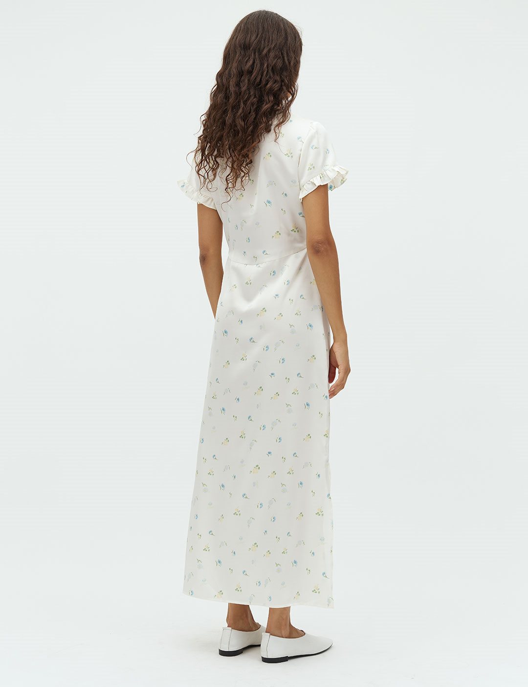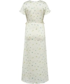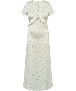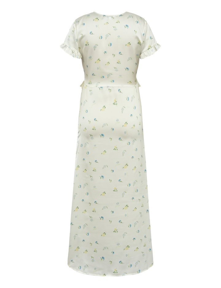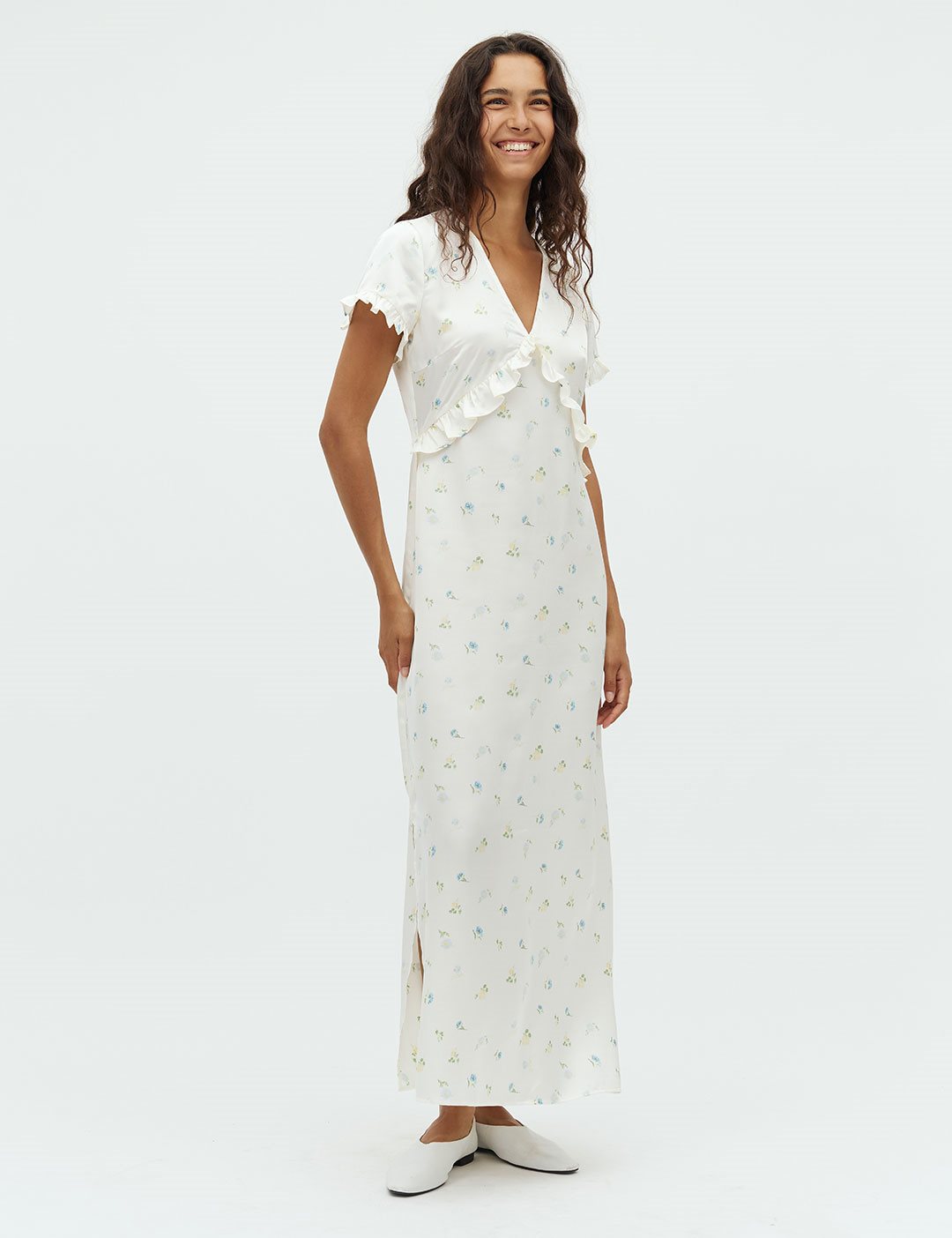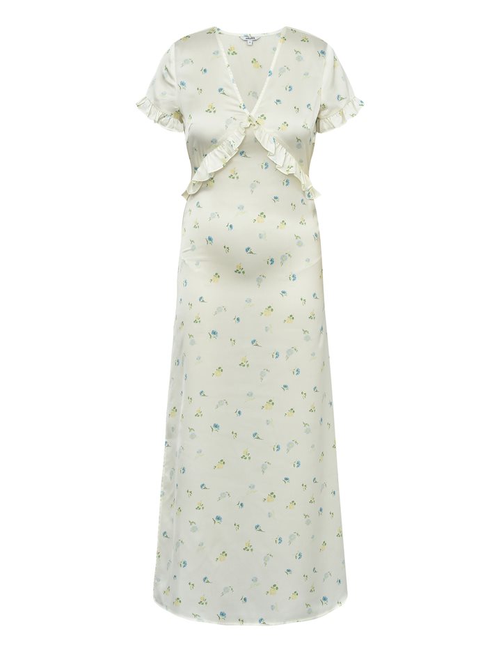 Maxi dress with ruffles and floral print.- Material: 100% Polyester- V-neck- Ruffles- Loose fit- Maxi length- Satin material