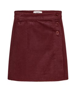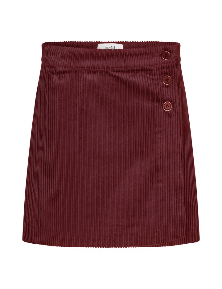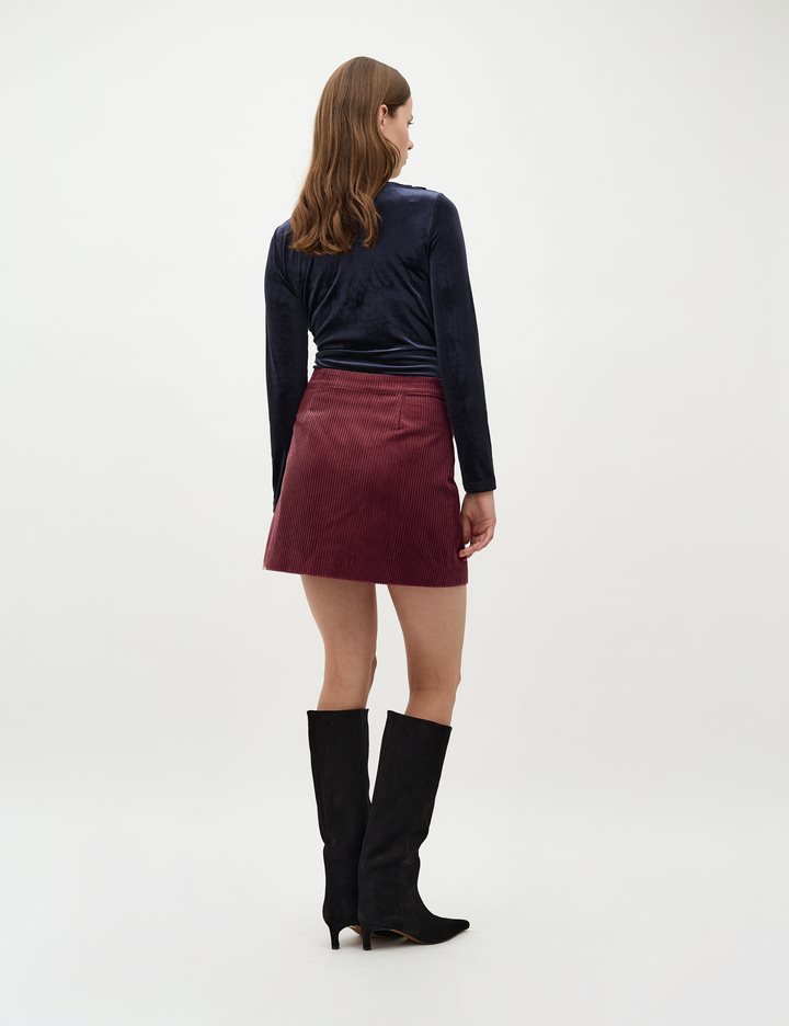 Pretty skirt in velvet material- Material: 100% Cotton – Inside: 100% Polyester- With 3 front buttons- Wrap effect- Cool velvet material- Colour: BordeauxThe height of the model is 178 cm and she is wearing a size S.