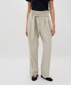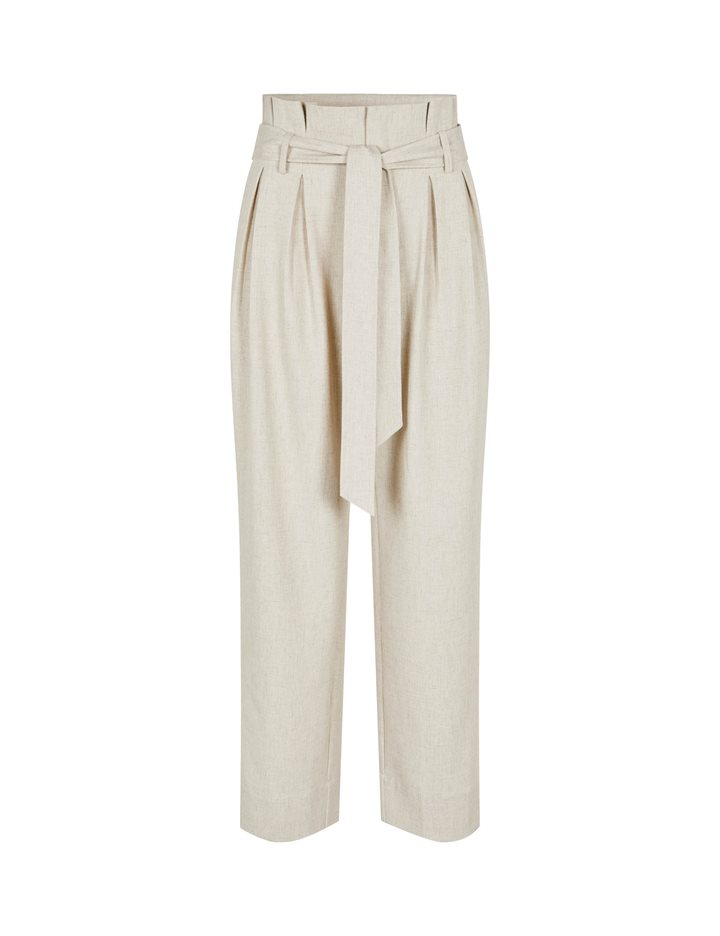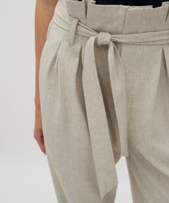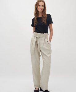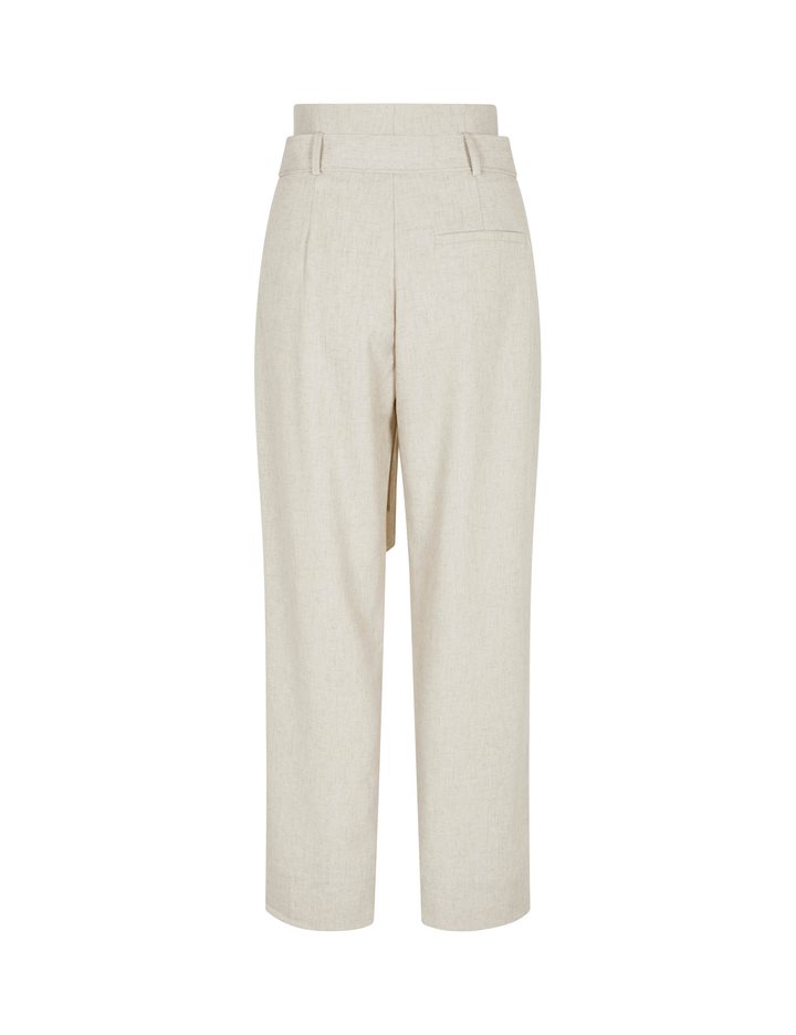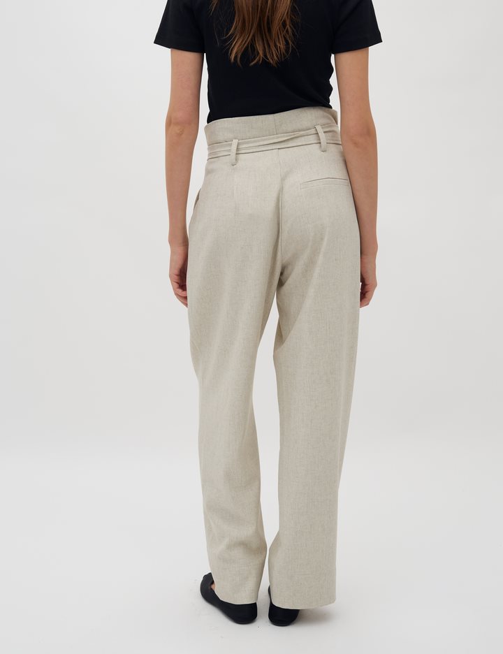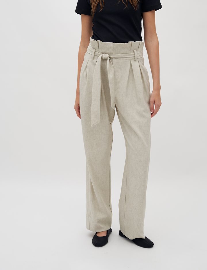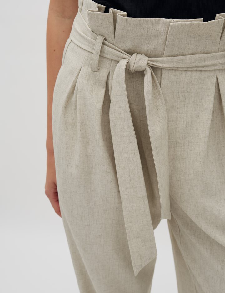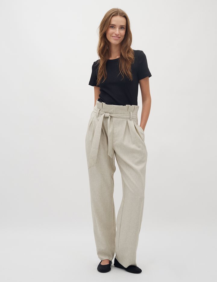 Trousers with a paperbag waist and ties.- Material: 89% Polyester, 7% Linen, 4% Elastane- Full length- Paperbag waist- Removable tie strap- Side pockets- Piped back pocket- Relaxed fitThe height of the model is 176 cm and she is wearing a size s.