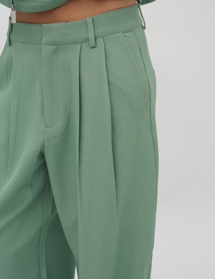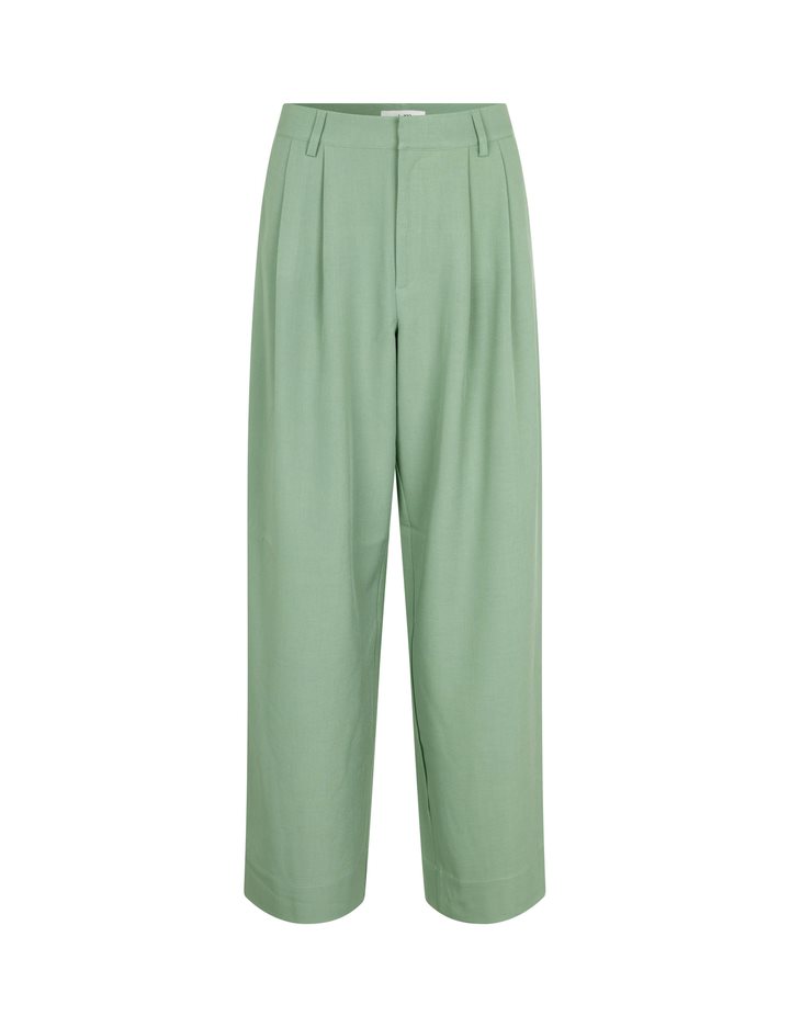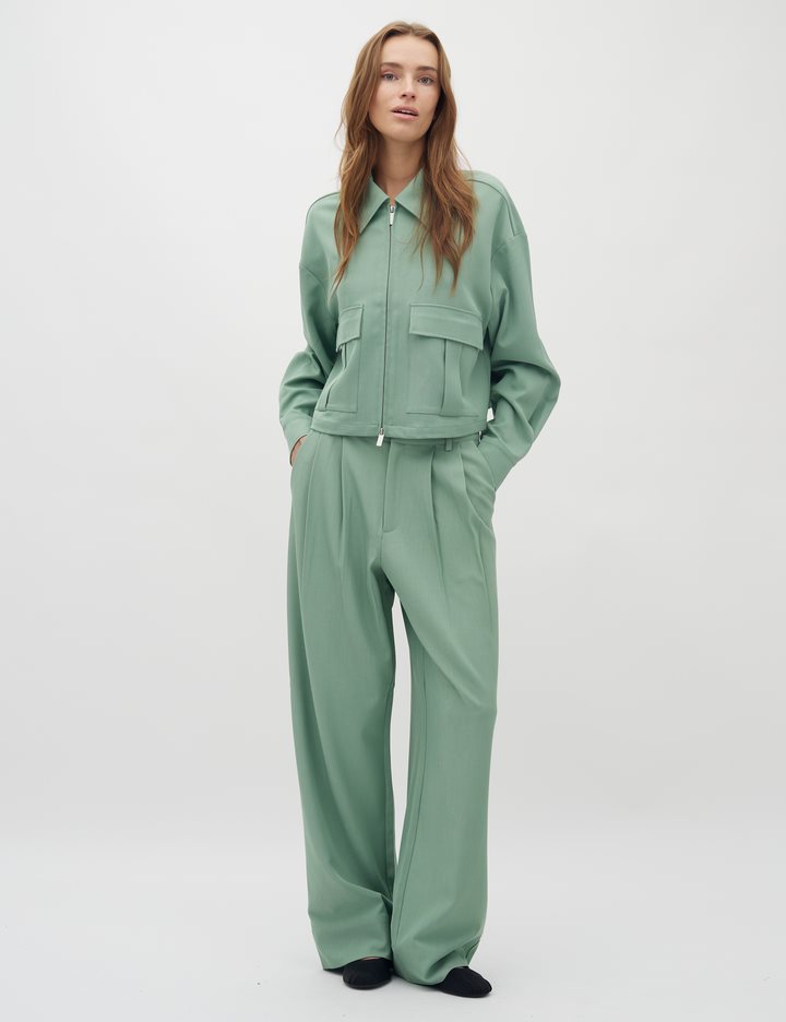 Loose trousers with straight legs.- Material: 97% Polyester, 3% Elastane- Side pockets- Closes with button and zipper- Belt straps- Piped back pockets- Soft and light quality- Relaxed fit- Color: Mineral GreenThe height of the model is 176 cm and she is wearing a size S. She is wearing the matching Alicenna-M blazer.