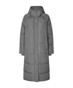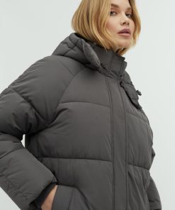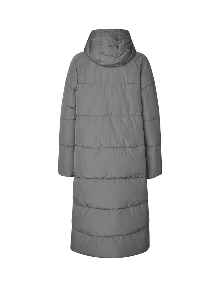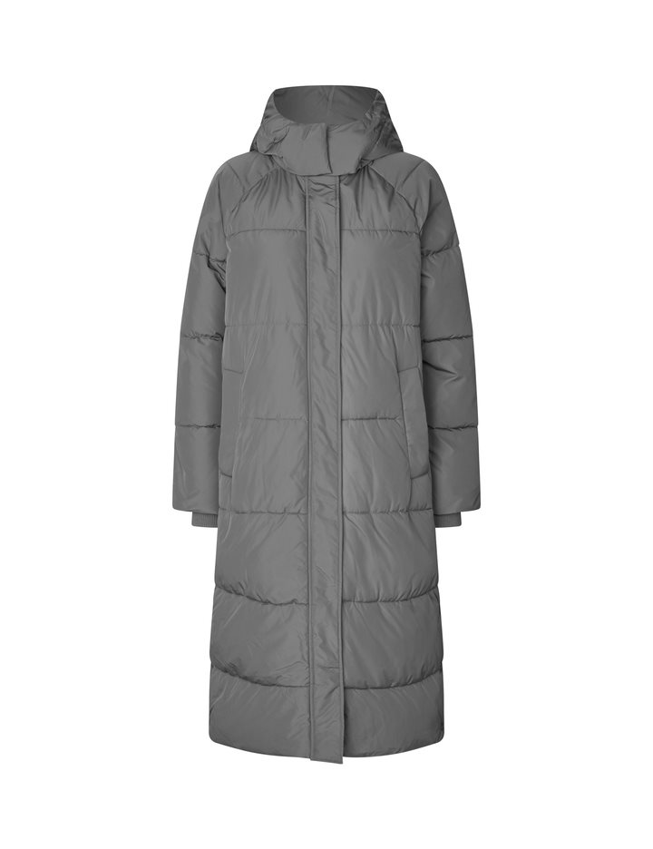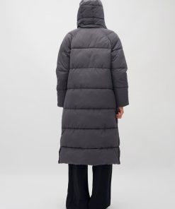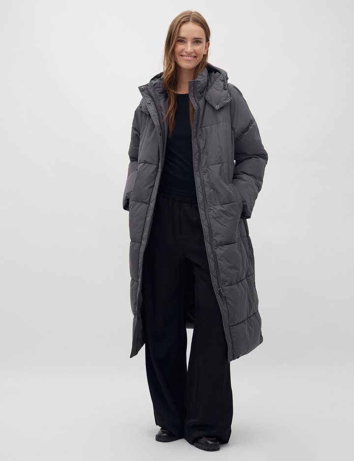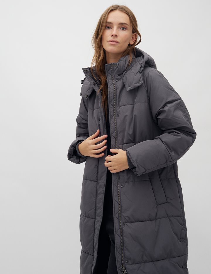 Long puffer jacket with hoodie.- Material:Shell: 100% Recycled Polyester, Lining: 100% Polyester- Long sleeves with concealed elastication at the cuffs- Zip and button closure- Front pockets- Long winter jacket- Hoodie- Stand-up collar- Side slits with button closure- Colour: MagnetThe height of the dark haired model is 172 cm and she is wearing a size s/m- Chest width: 60 cm in size s/m- Length: 120 cm in size s/m