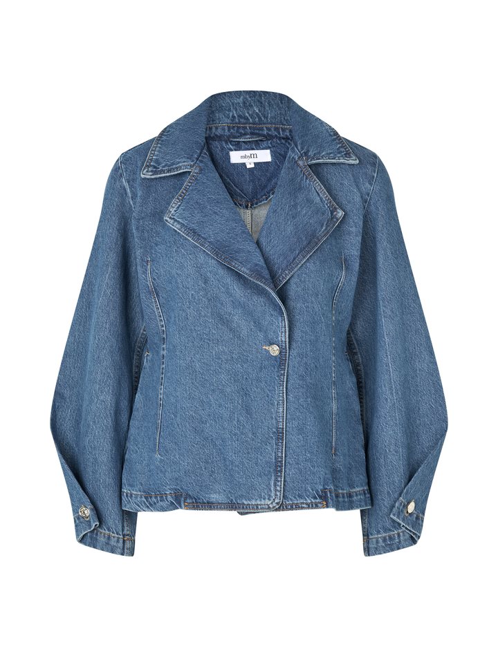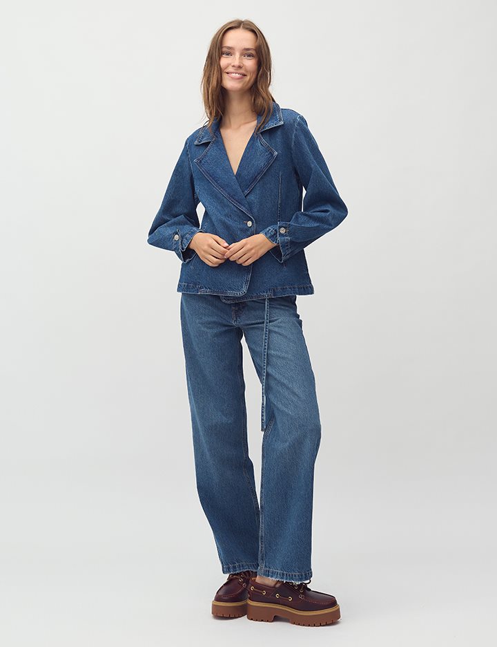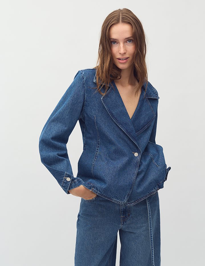 Denim blazer/jacket with button details.- Material: 100% Cotton- Long sleeves with button details at the cuffs- Single button closure- Collar- Back slit- Relaxed fit with a slight adjusted waistThe model's height is 174 cm and she is wearing a size S.