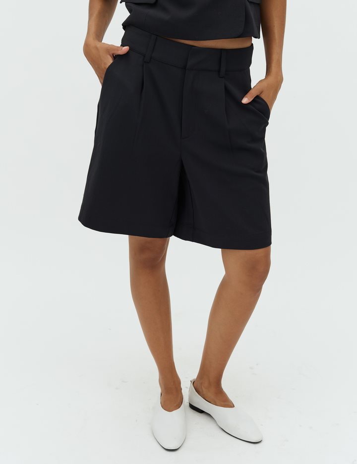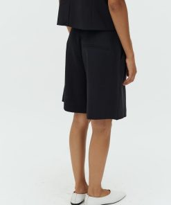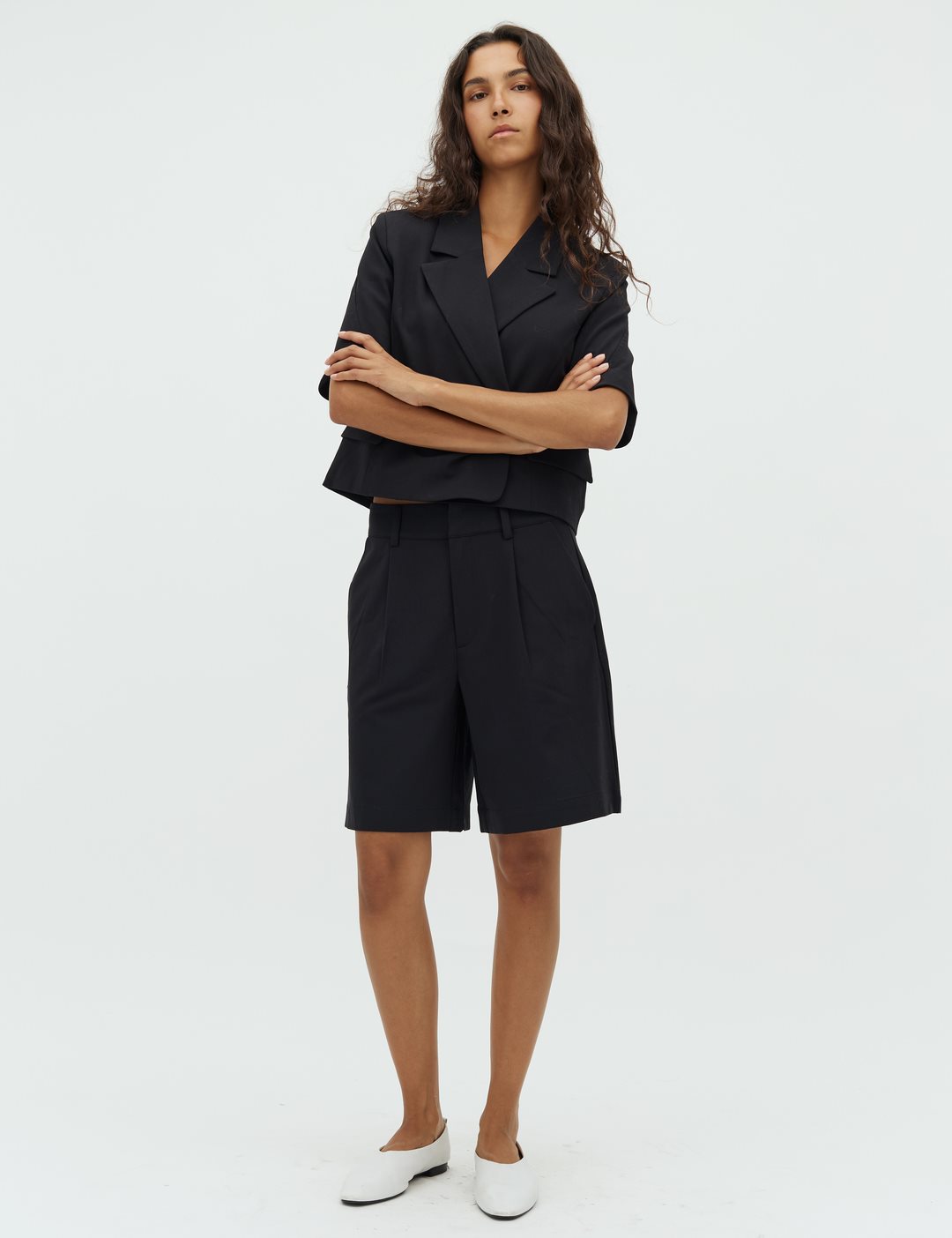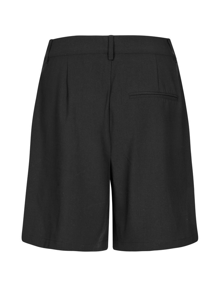 Suit shorts with wide legs.- Material: 63% Polyester, 33% Viscose, 4% Elastane- Wide legs- Light a-shape- Belt straps- Hook and zip closure- Side pockets- Piped back pocket