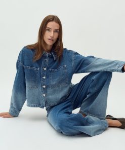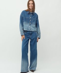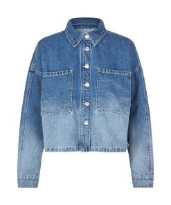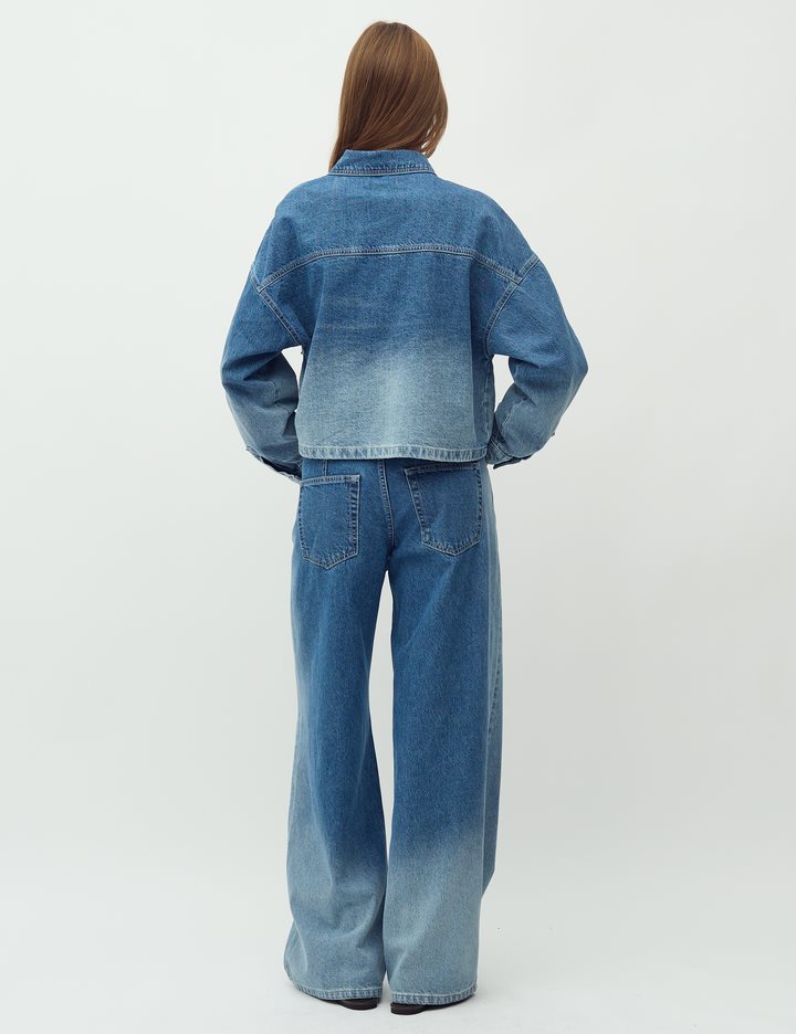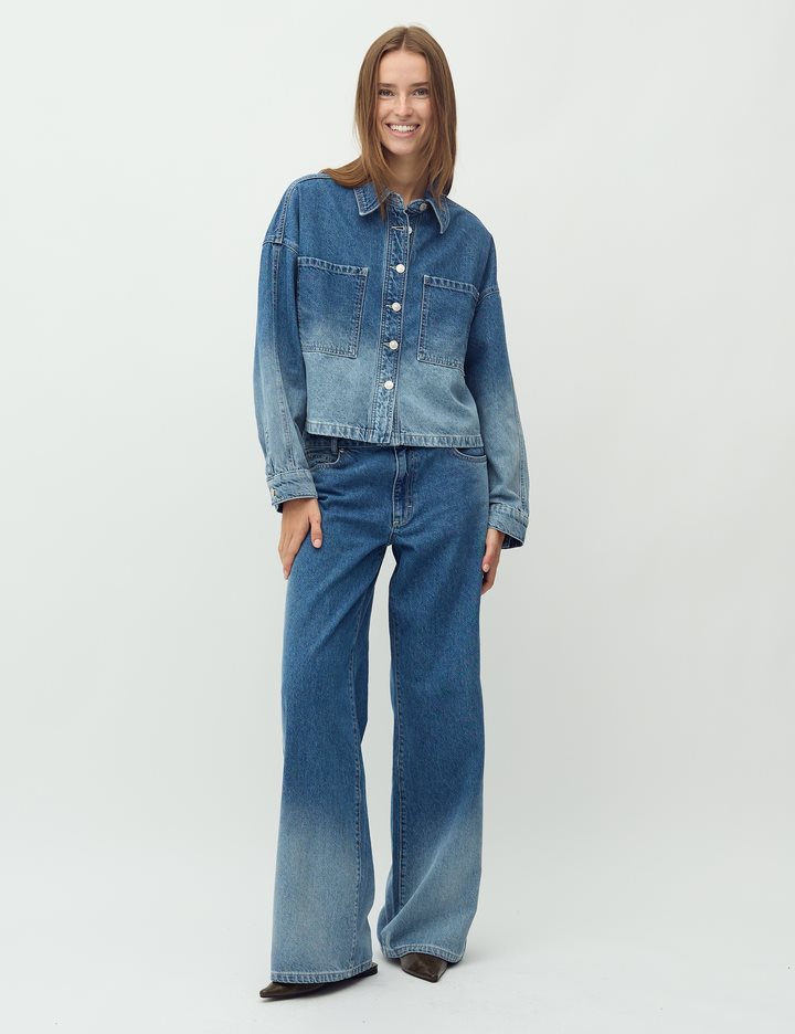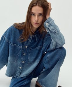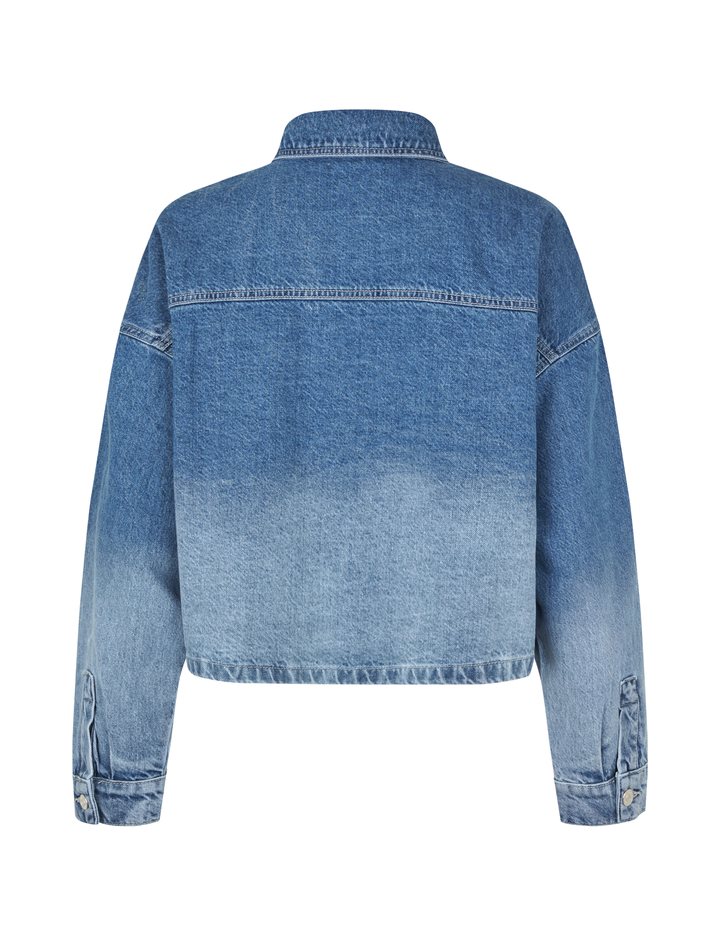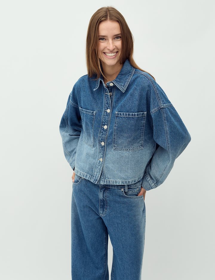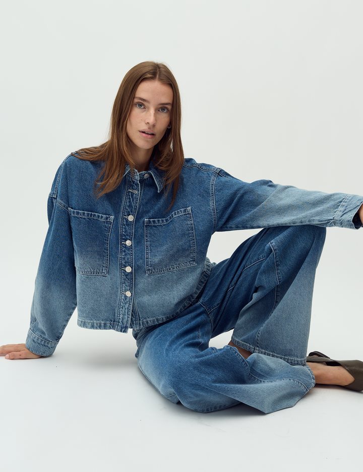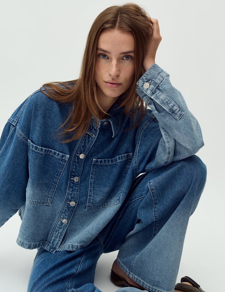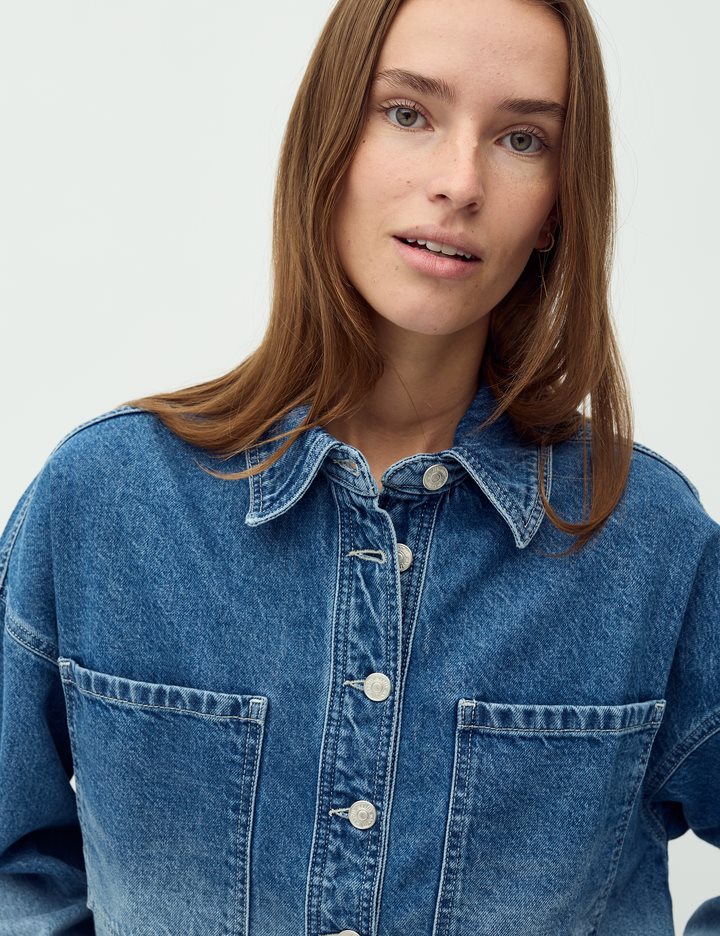 Denim jacket in a fading denim wash.- Material: 100% Cotton- Oversized- Short length- Faded denim wash- Button closure- Large pocket on the chestThe model is 176 cm and is wearing a size S.