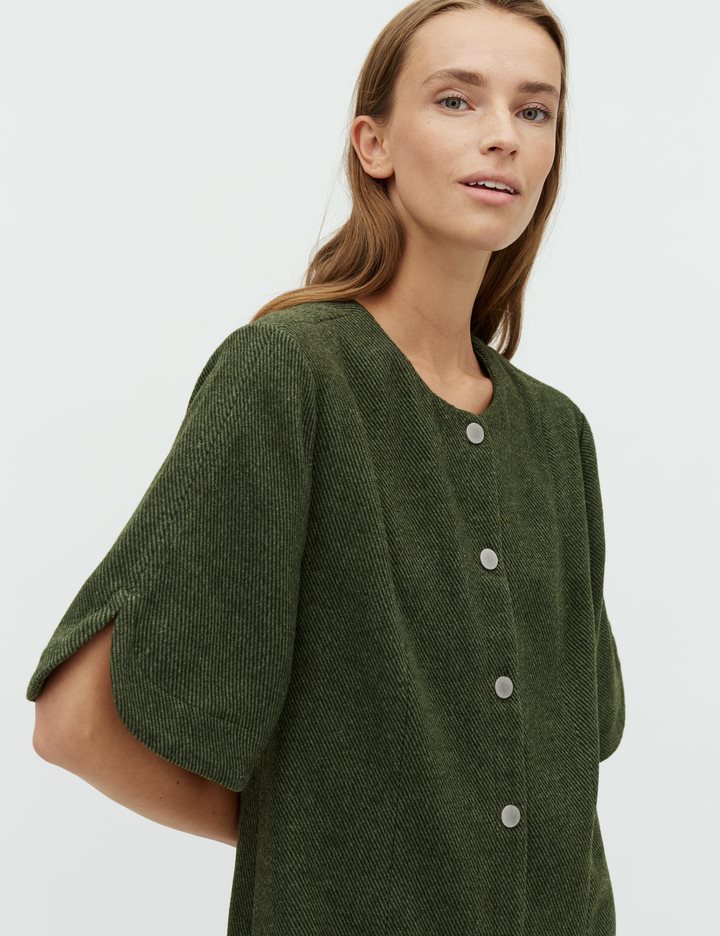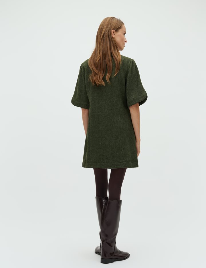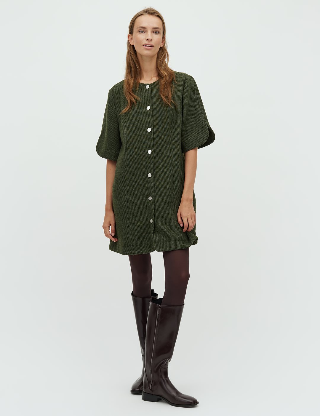 Herringbone mini dress with buttons.- Material: 92% Polyester, 5% Wool, 3% Elastane- Mini length- Loose fit- Short loose sleeves- Button closure- Thick fabricThe model's height is 176 cm and she is wearing a size S.