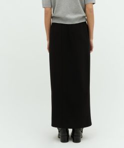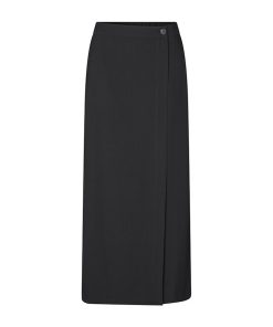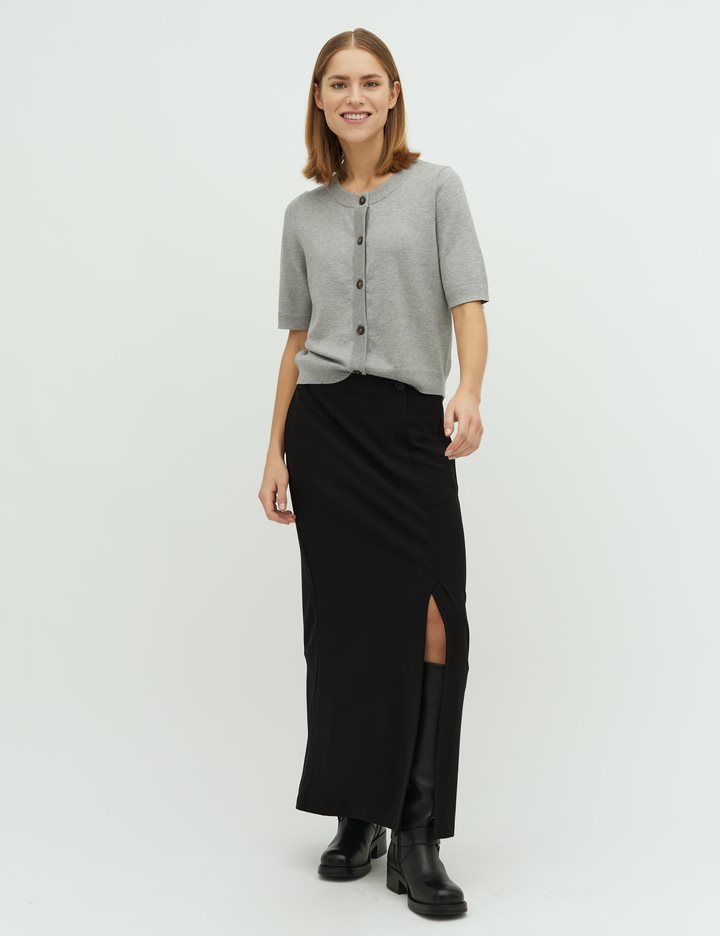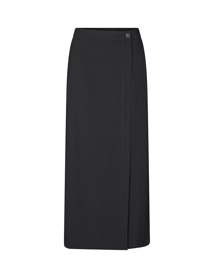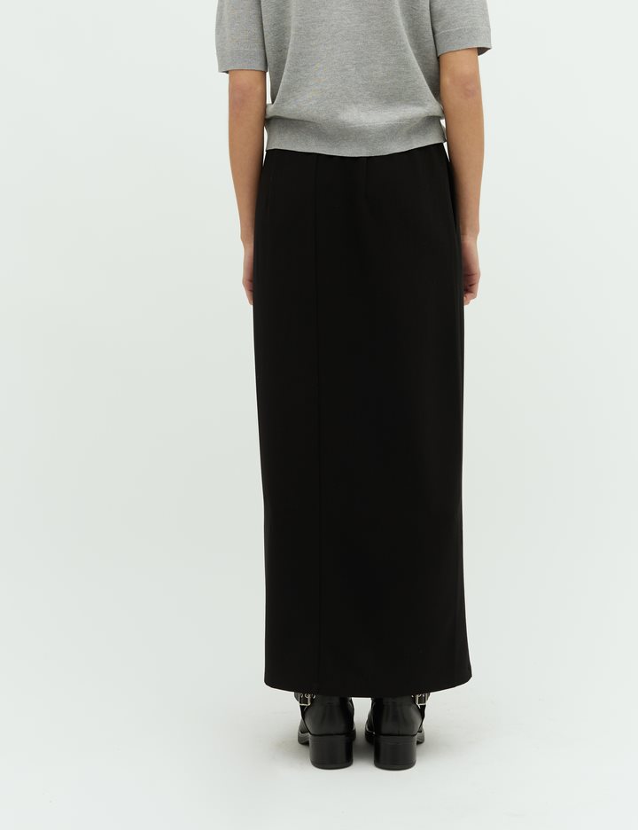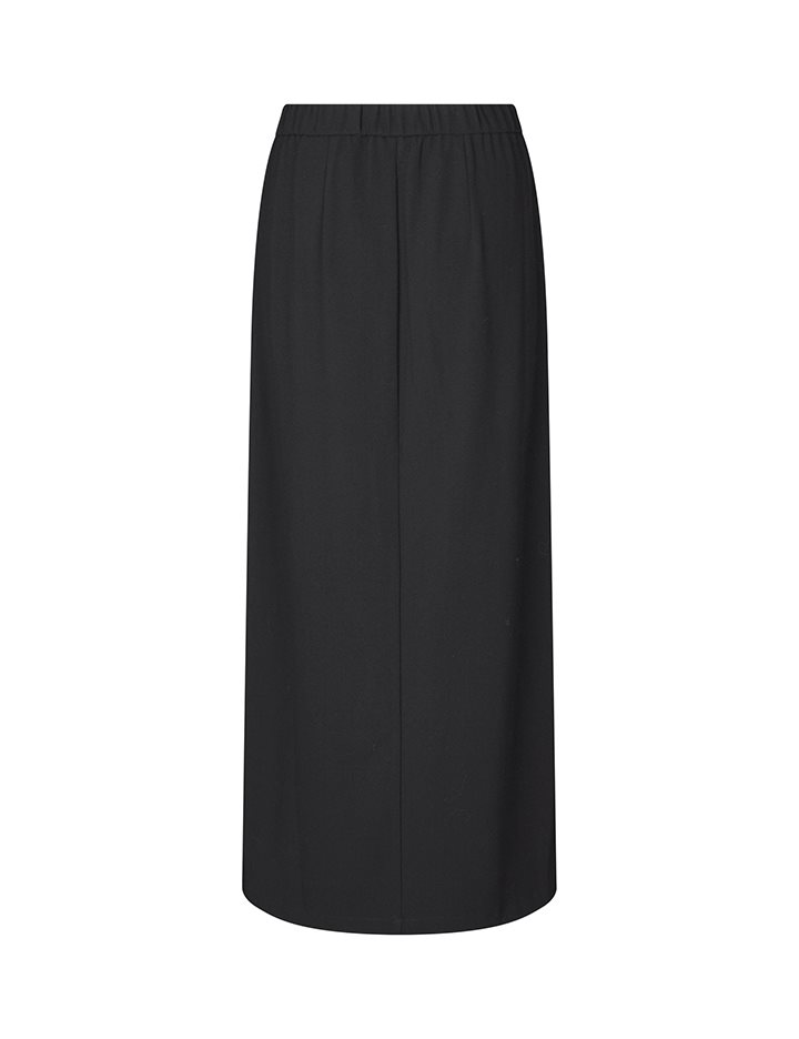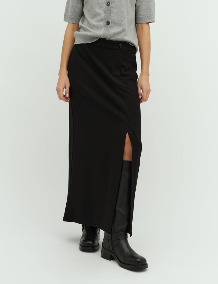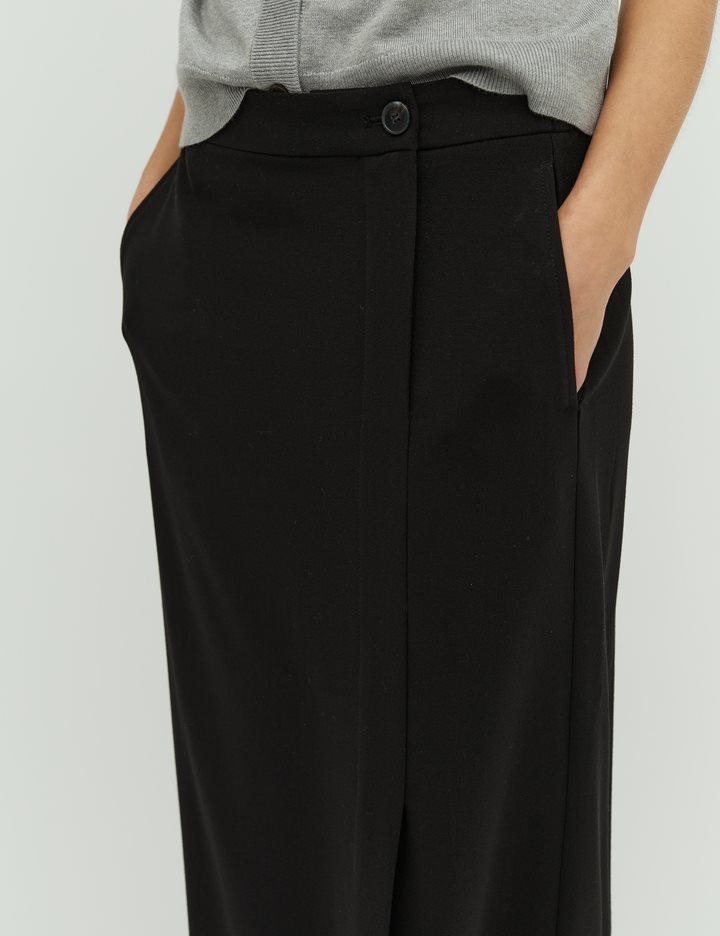 Maxi skirt with slit.- Material: 63% Polyester, 33% Viscose, 4% Elastane- Elastic waist- Detail with "skewed" button and hidden zip- Front slit- Side pockets- Soft qualityThe height of the model is 175 cm and she is wearing a size S.