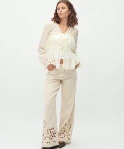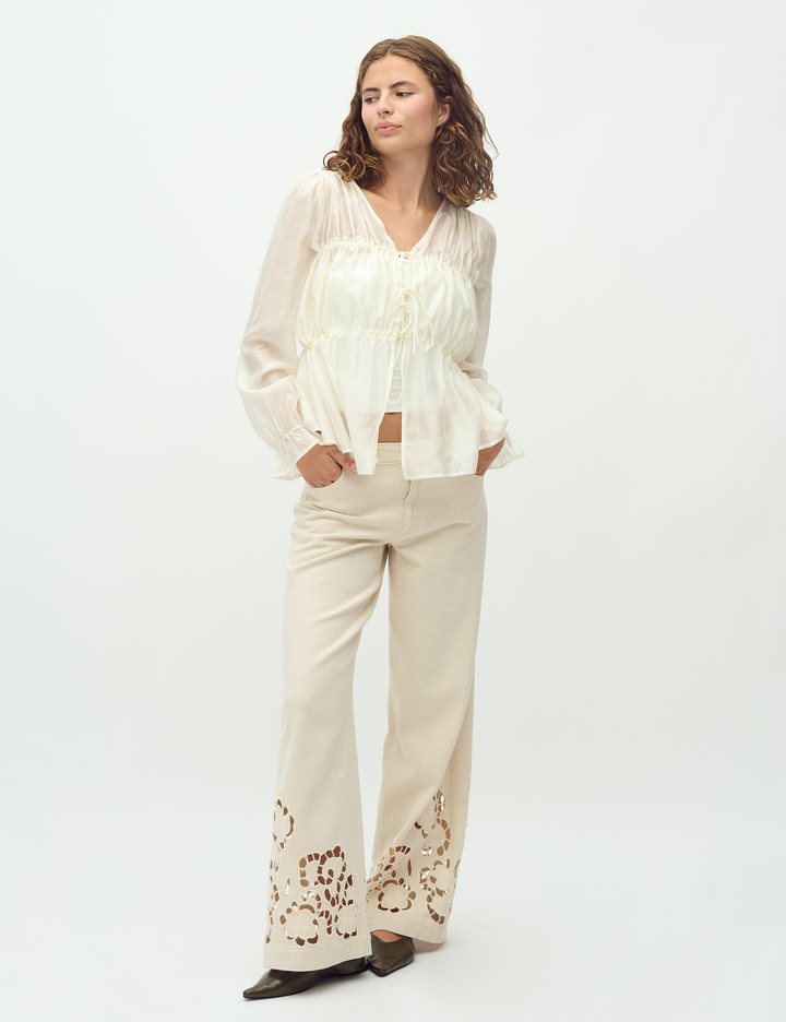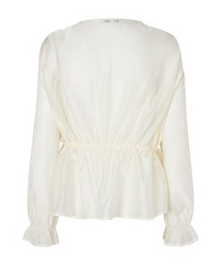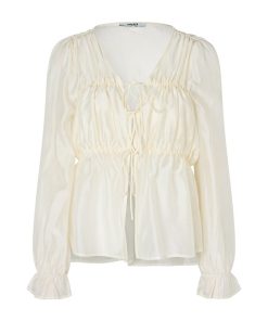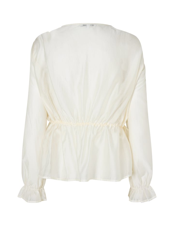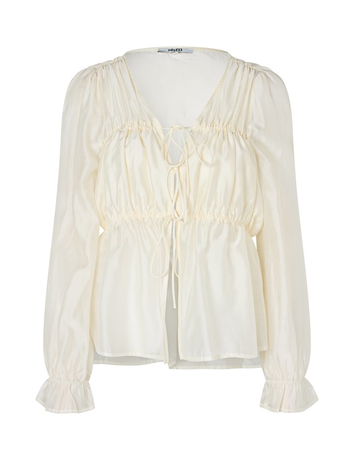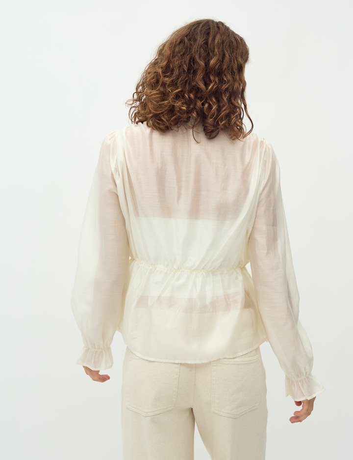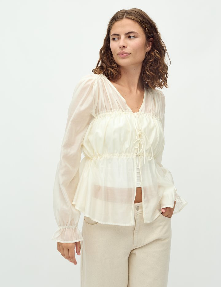 Blouse with ruched design and tie front.- Material: 85% Lyocell, 15% Polyester- Long sleeves with elastic detail- Front ties- Loose fit- Ruched design- See-through qualityThe model's height is 176 cm and she is wearing a size S.