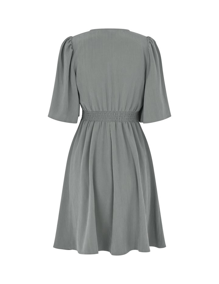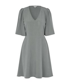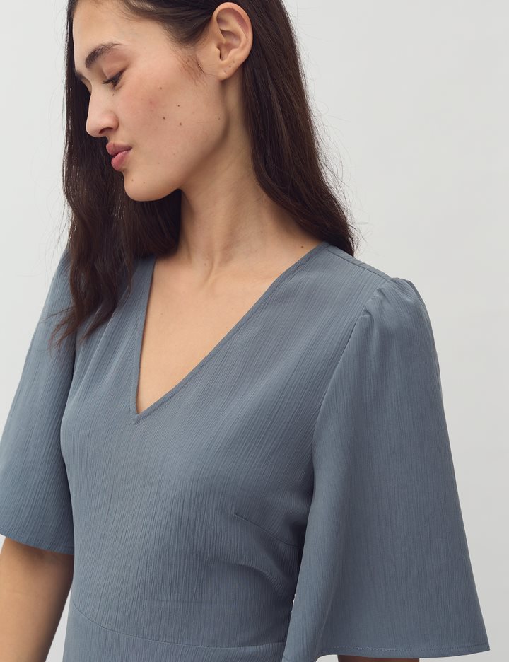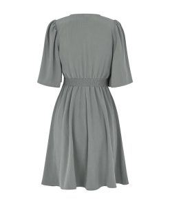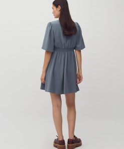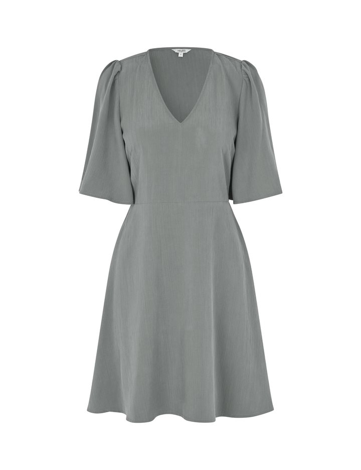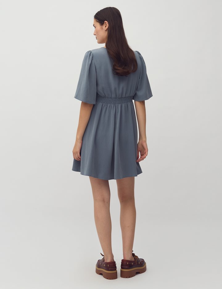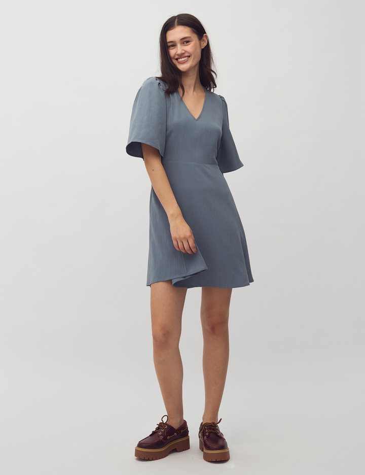 Woven dress with v-neck.- Material: 73% TENCELâ„¢ Modal, 27% Polyester- Loose sleeves with a little puff at shoulders- V neck- Tight on the chest- Mini length- Elasticated edge on the backThe height of the model is 176 cm and she is wearing a size S.