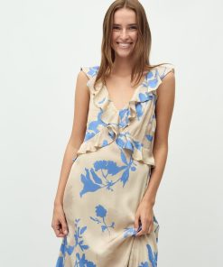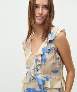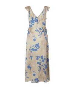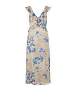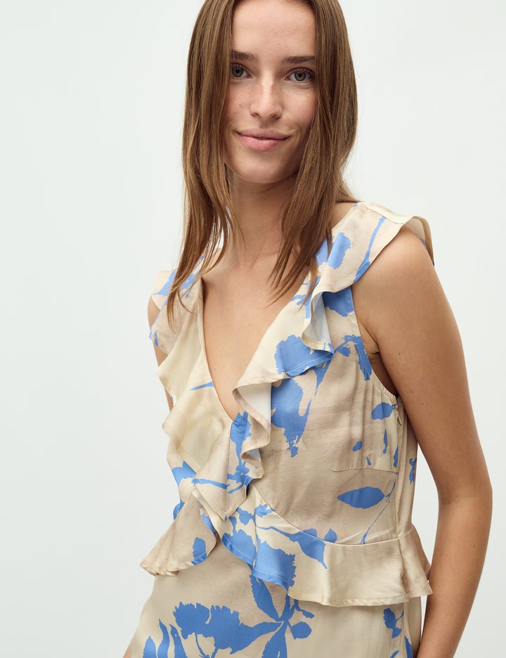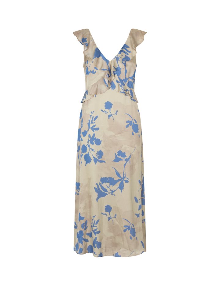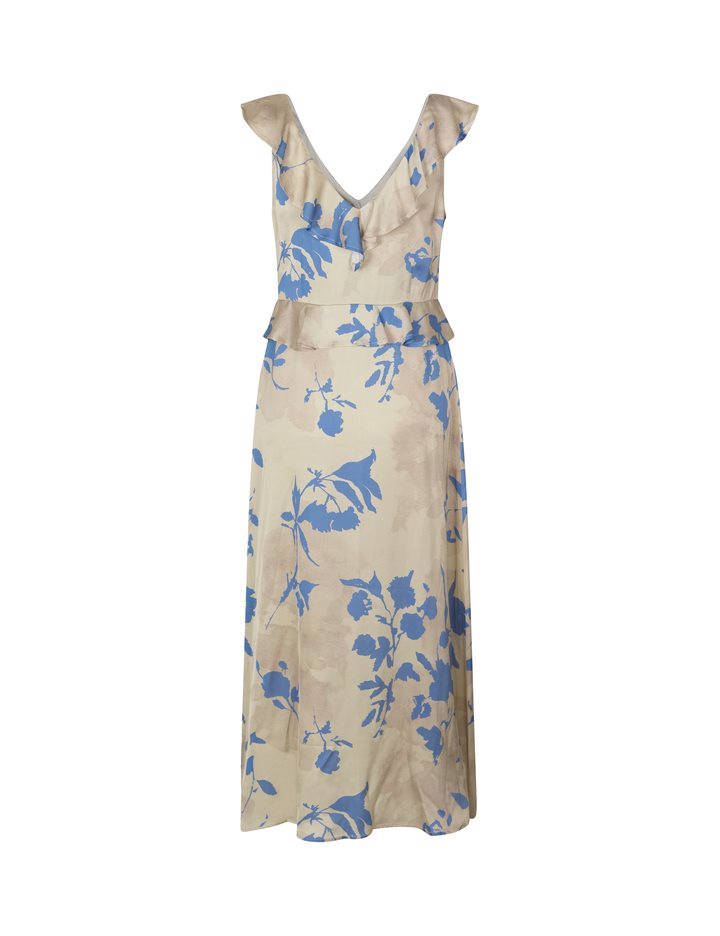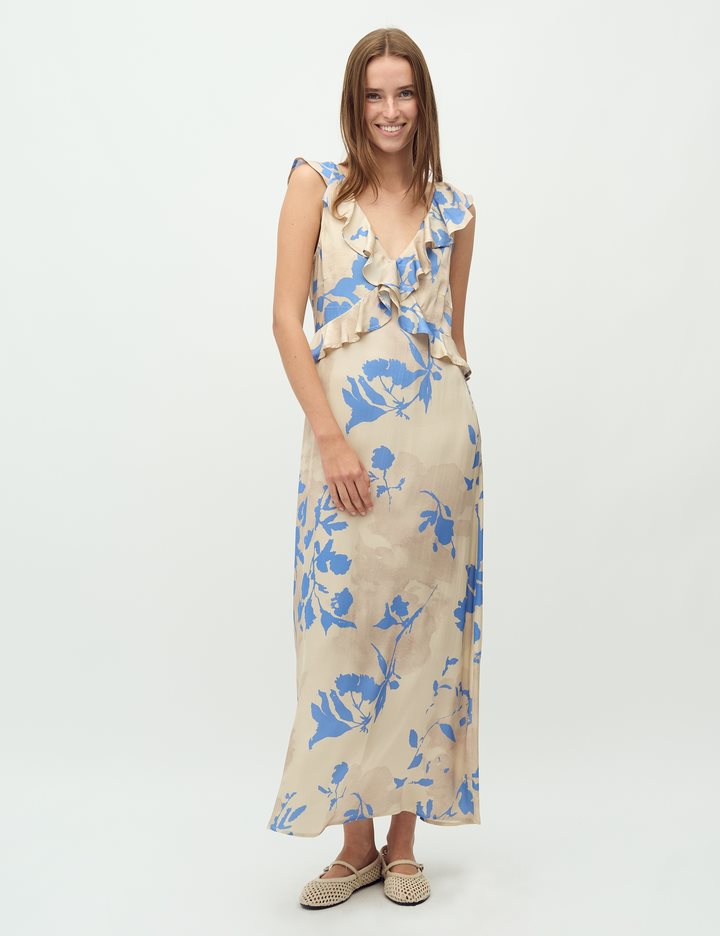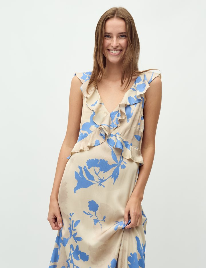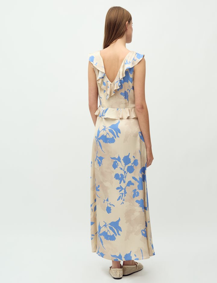 Feminine maxi dress with ruffles and print.- Material: 58& Ecovero Viscose, 42% Viscose- Maxi length- V-neck- Closes with zipper on the side- Ruffle details- Loose fitThe model's height is 176 cm and she is wearing size S.