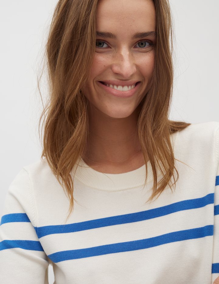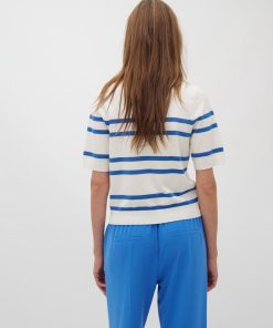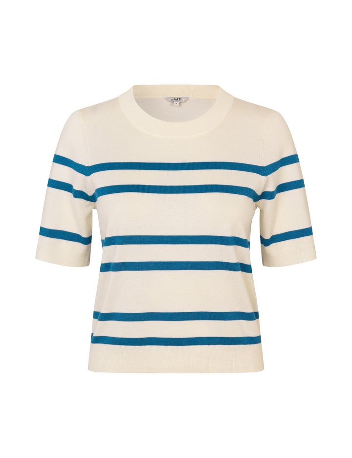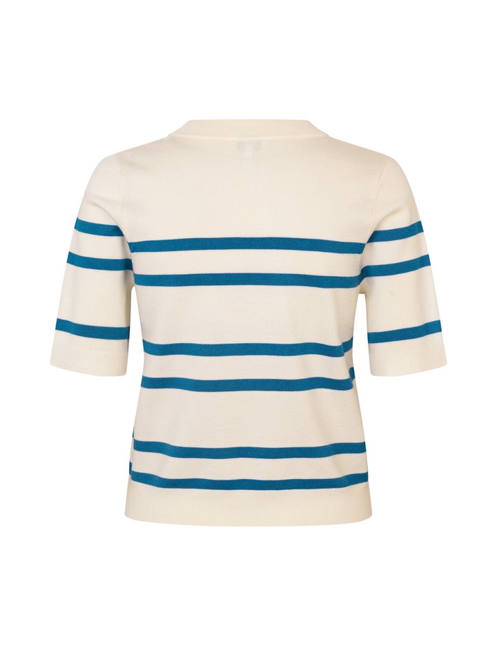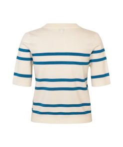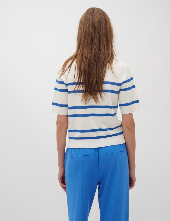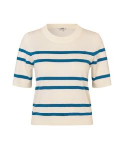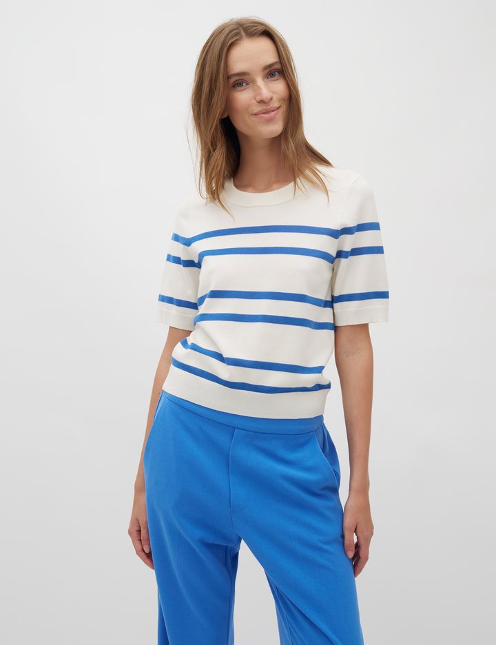 Thin knit sweater with short sleeves.- Material: 70% Viscose, 30% Polyester- Round neck- Normal length- Relaxed fit- Short sleeves with ribbed trim- Ribbed hems- Color: Sugar Star Sapphire StripeThe height of the model is 175 cm and she is wearing a size S.