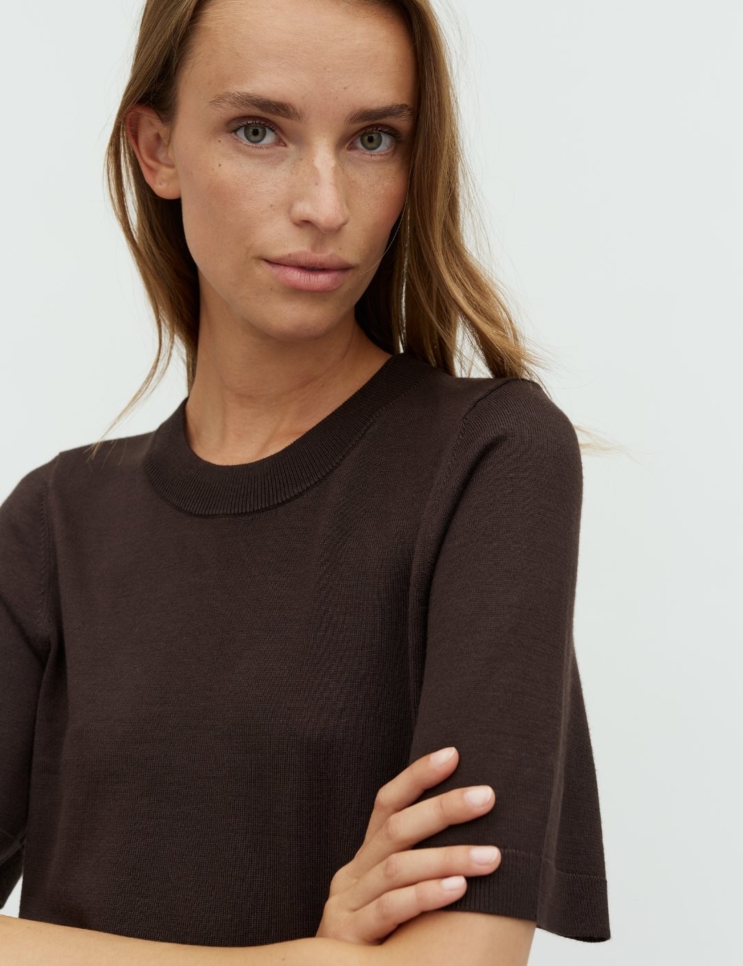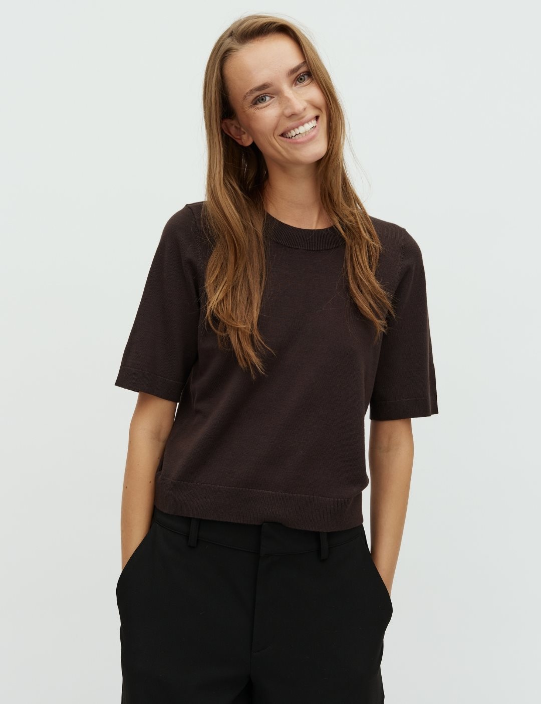 Thin knit sweater with short sleeves.- Material: 70% Viscose, 30% Polyester- Round neck- Normal length- Relaxed fit- Short sleeves with ribbed trim- Ribbed hems