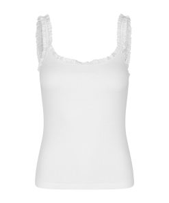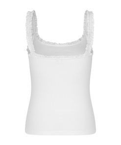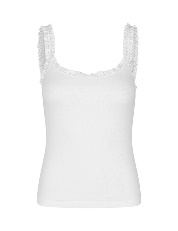 Basic top with ruffled hem.- Material 95% Cotton, 5% Polyester- Soft quality- Details on straps- Tight fit- Color: WhiteThe height of the model is 175 cm and she is wearing a size S.