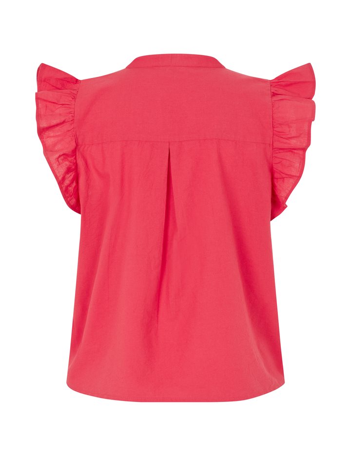 Top with ruffle details at the shoulders.- Material: 100% Cotton- Sleeveless- Round neck with v-neck- Relaxed fit- Pattern in the fabric- Normal length