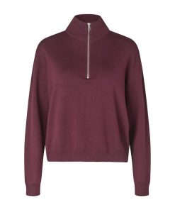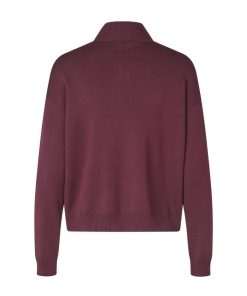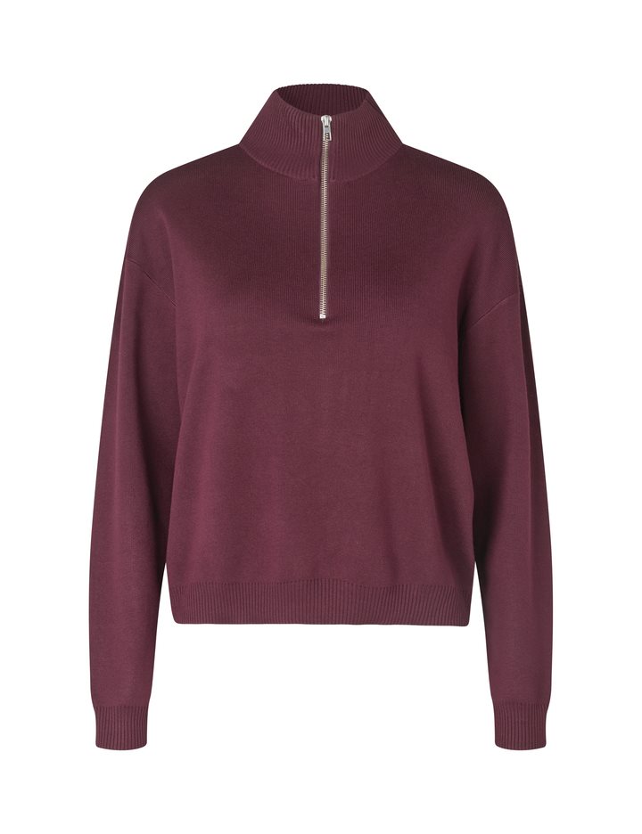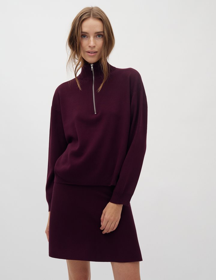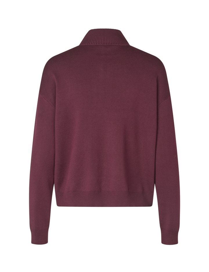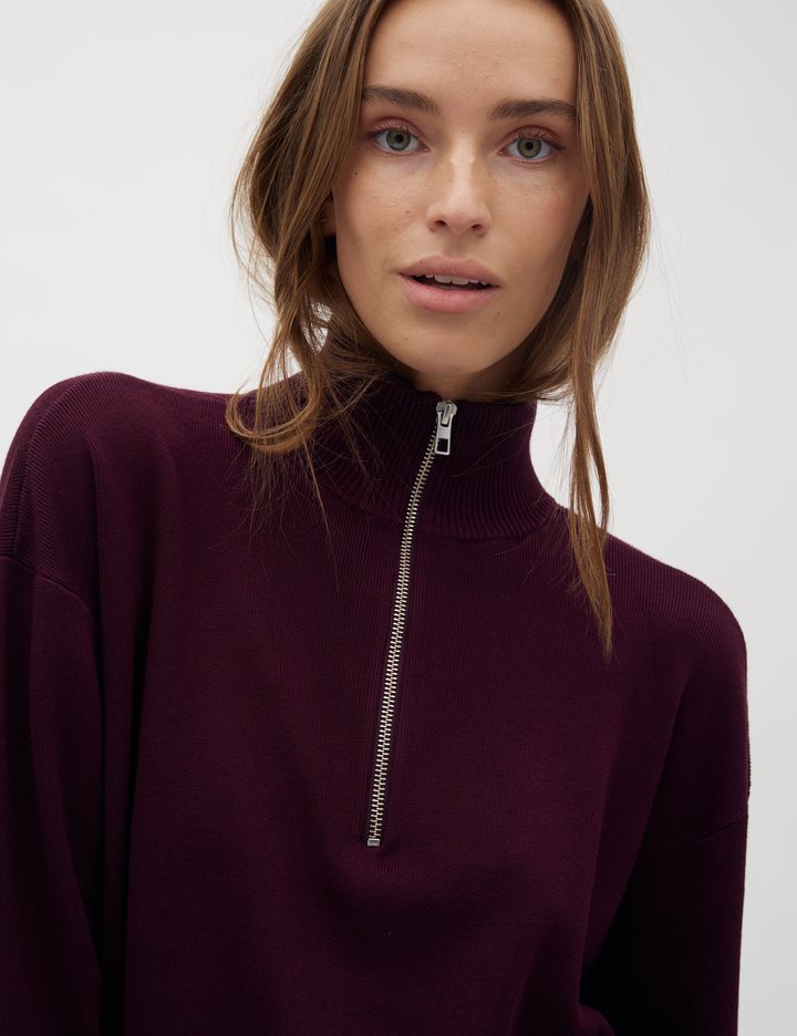 Long-sleeved knit jumper with high neck and zip.- Material: 70% Viscose, 30% Polyester- Long sleeves with ribbed trim- High neck with zipper- Ribbed edges at neck, sleeves and bottom- Relaxed fit