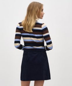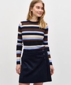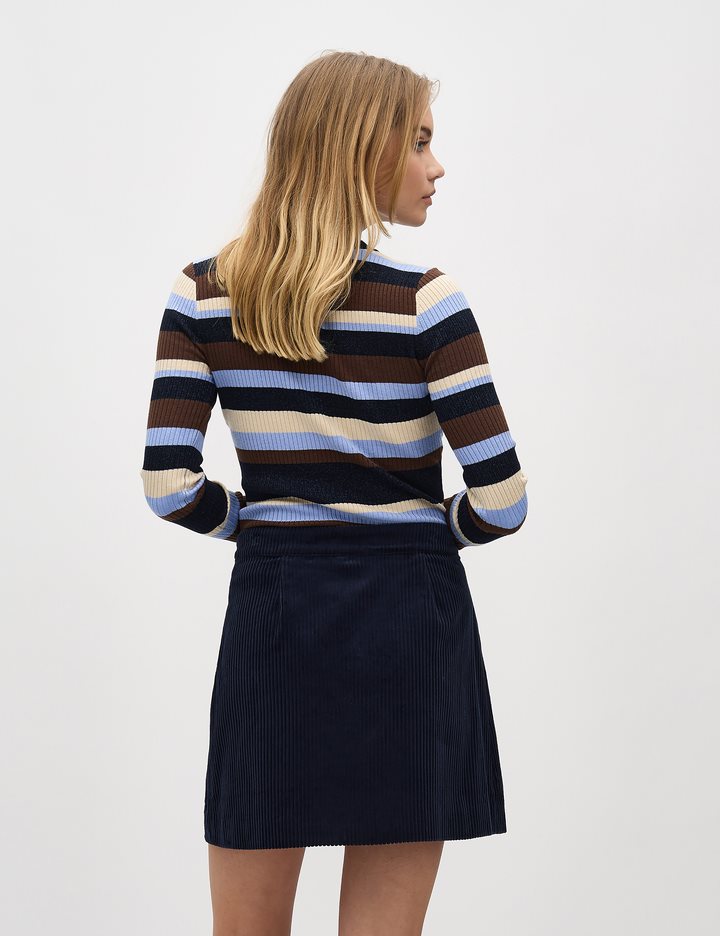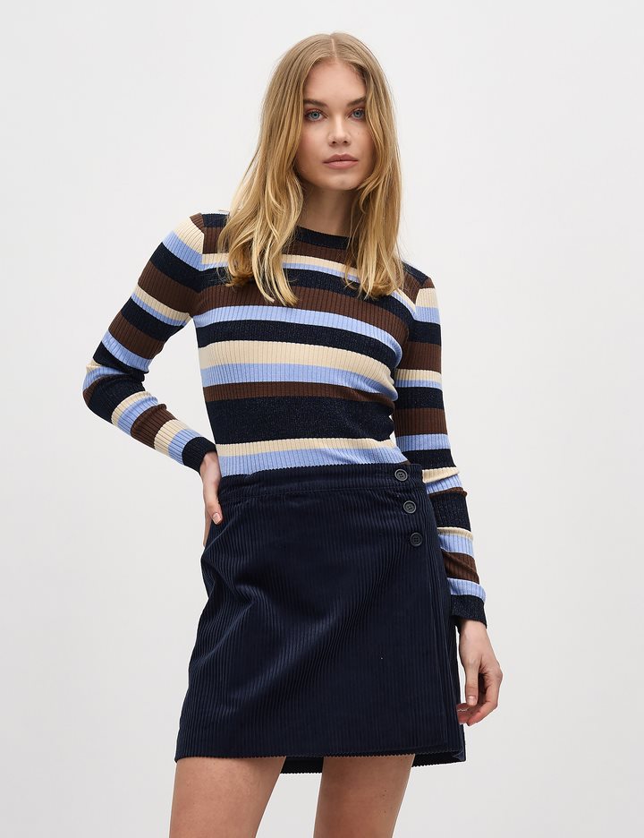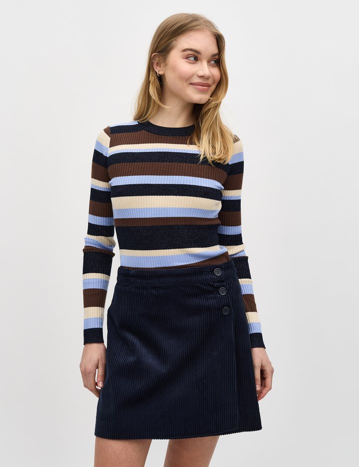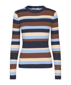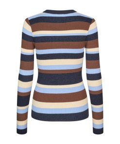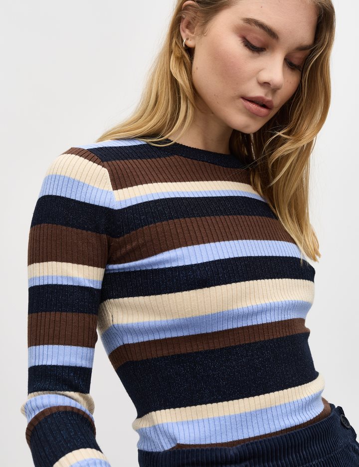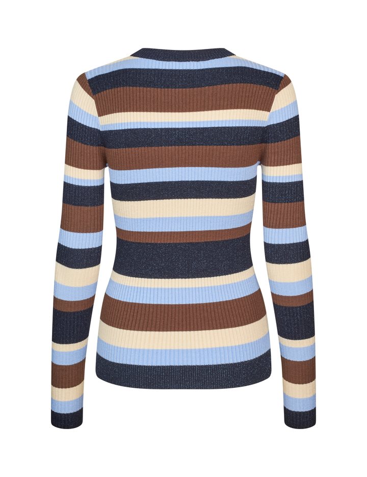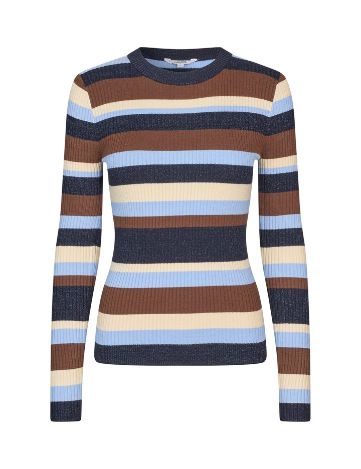 Thin knitted sweater with stripes and round neck.- Material: 38% Viscose, 37% Acrylic, 14% Nylon, 9% Metallic fiber, 2% Elastane- Round neck- Striped- Tight fit- Color: Serenity Lurex StripeThe height of the model is 178 cm and she is wearing a size S.