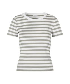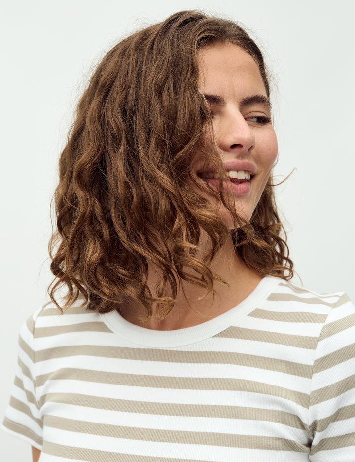 Simple t-shirt in a ribbed quality- Material: 95% Cotton, 5% Elastane- Round neckline- Short sleeves- Tight fit- Rib quality
