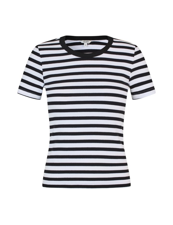 Simple t-shirt in a ribbed quality- Material: 95% Cotton, 5% Elastane- Round neckline- Short sleeves- Tight fit- Rib quality- Color: White Black Stripe